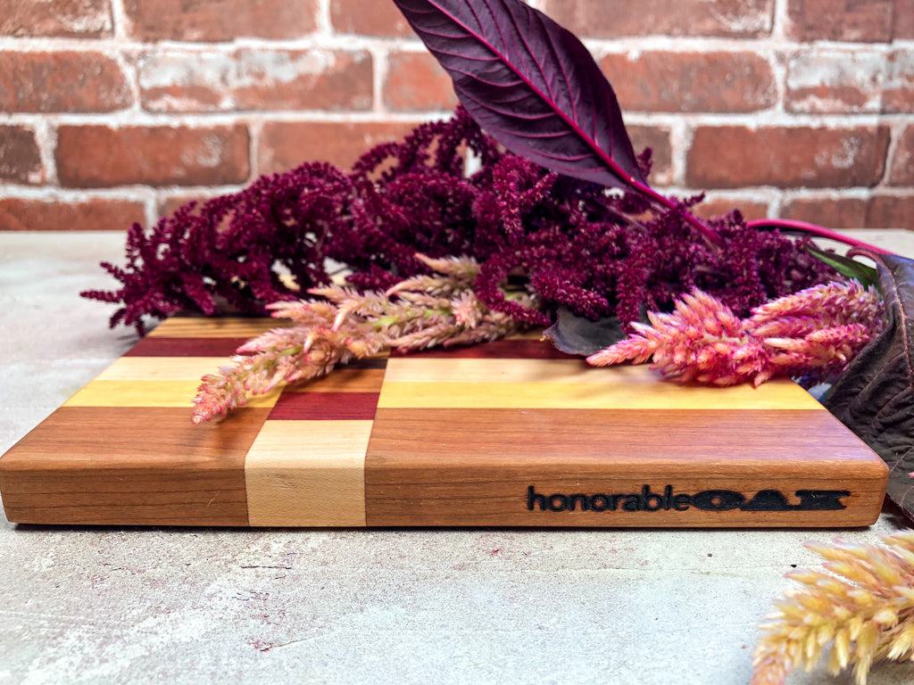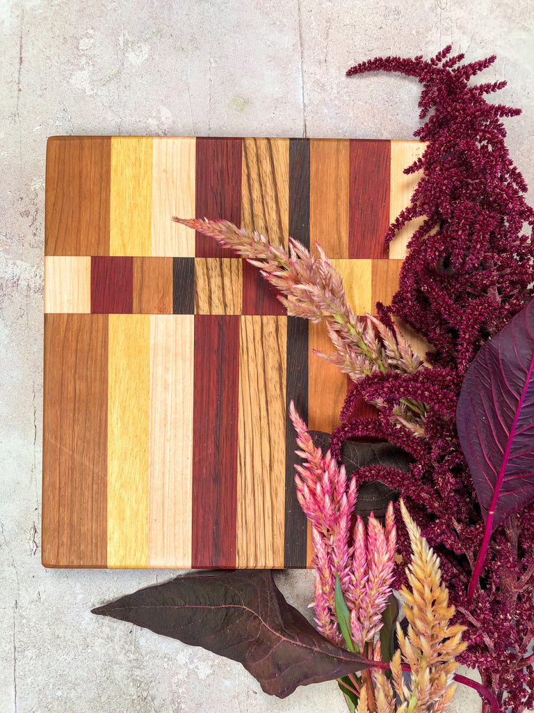 This high quality hardwood cutting board is a great gift for any chef or person who loves to cook. Each cutting board is a unique combination of woods from around the world and are selected for their individual beauty. The combined grain and color of the woods selected make it extra unique, meaning that no board will ever be the same!