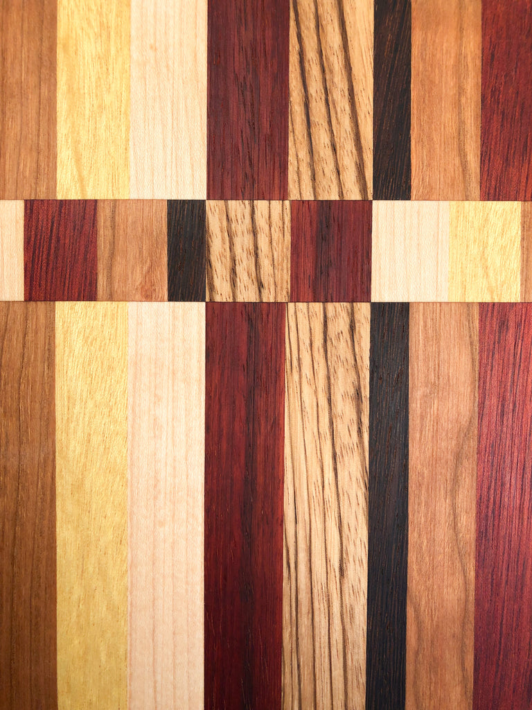 Made from some or all of the following as a primary wood: Hard Maple, Black Walnut, Purple-heart, Cherry, and Padauk; an upwards of 10 additional woods may be used. The depth and vibrancy of color come from the natural characteristics of each wood, and the wood color is natural and have no artificial coloring or staining.