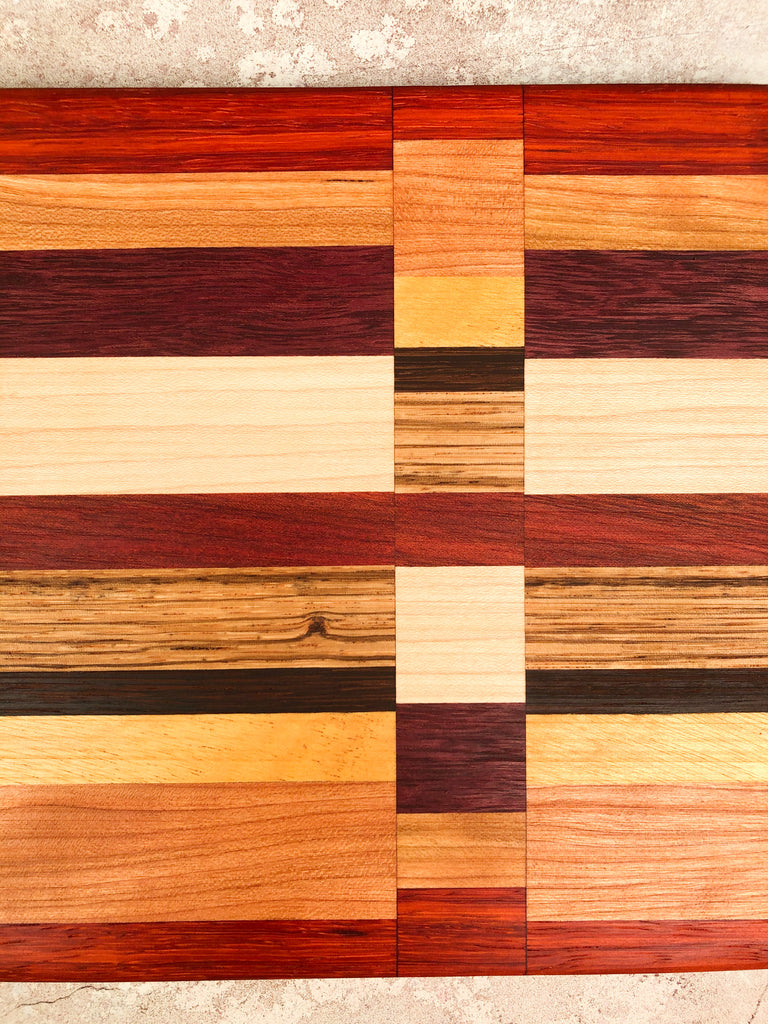 Made from some or all of the following as a primary wood: Hard Maple, Black Walnut, Purple-heart, Cherry, and Padauk; an upwards of 10 additional woods may be used. The depth and vibrancy of color come from the natural characteristics of each wood, and the wood color is natural and have no artificial coloring or staining.