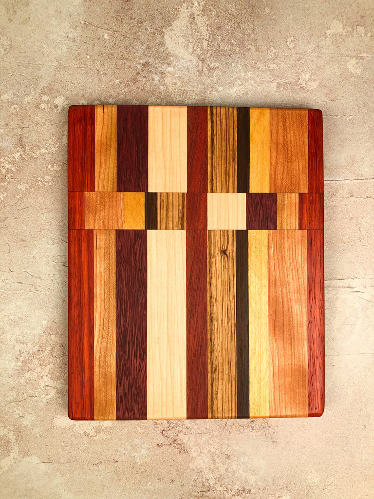 This high quality hardwood cutting board is a great gift for any chef or person who loves to cook. Each cutting board is a unique combination of woods from around the world and are selected for their individual beauty. The combined grain and color of the woods selected make it extra unique, meaning that no board will ever be the same!